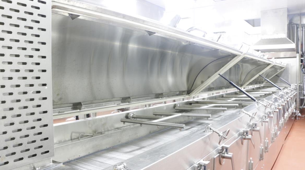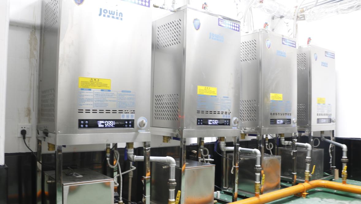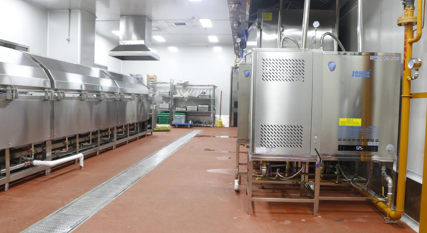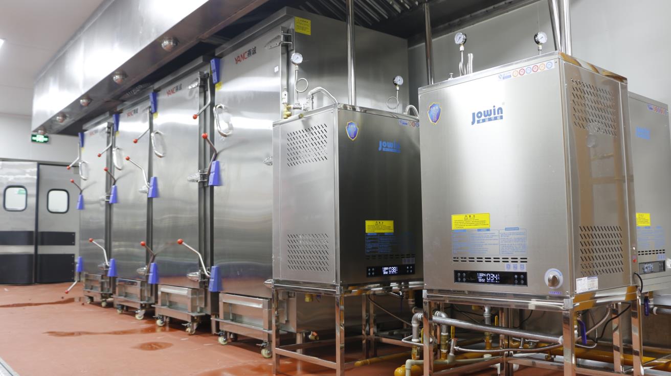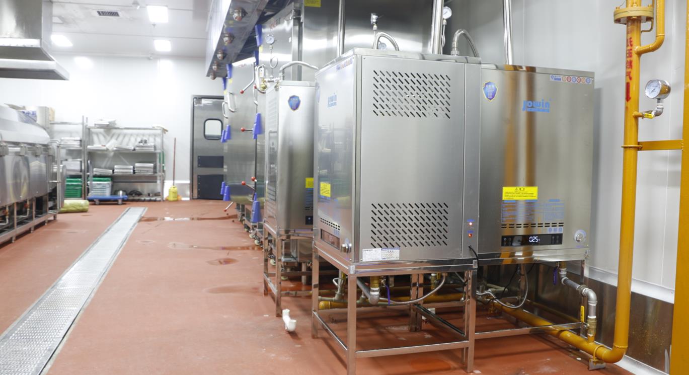 大和豐中央廚房采用8臺模塊式蒸汽發生器配套自動化米飯生產線,蒸汽溫度高達150℃,蒸汽壓力可達3公斤,4臺高溫蒸汽機配套推車式蒸箱,為深圳中小學生供餐保駕護航。