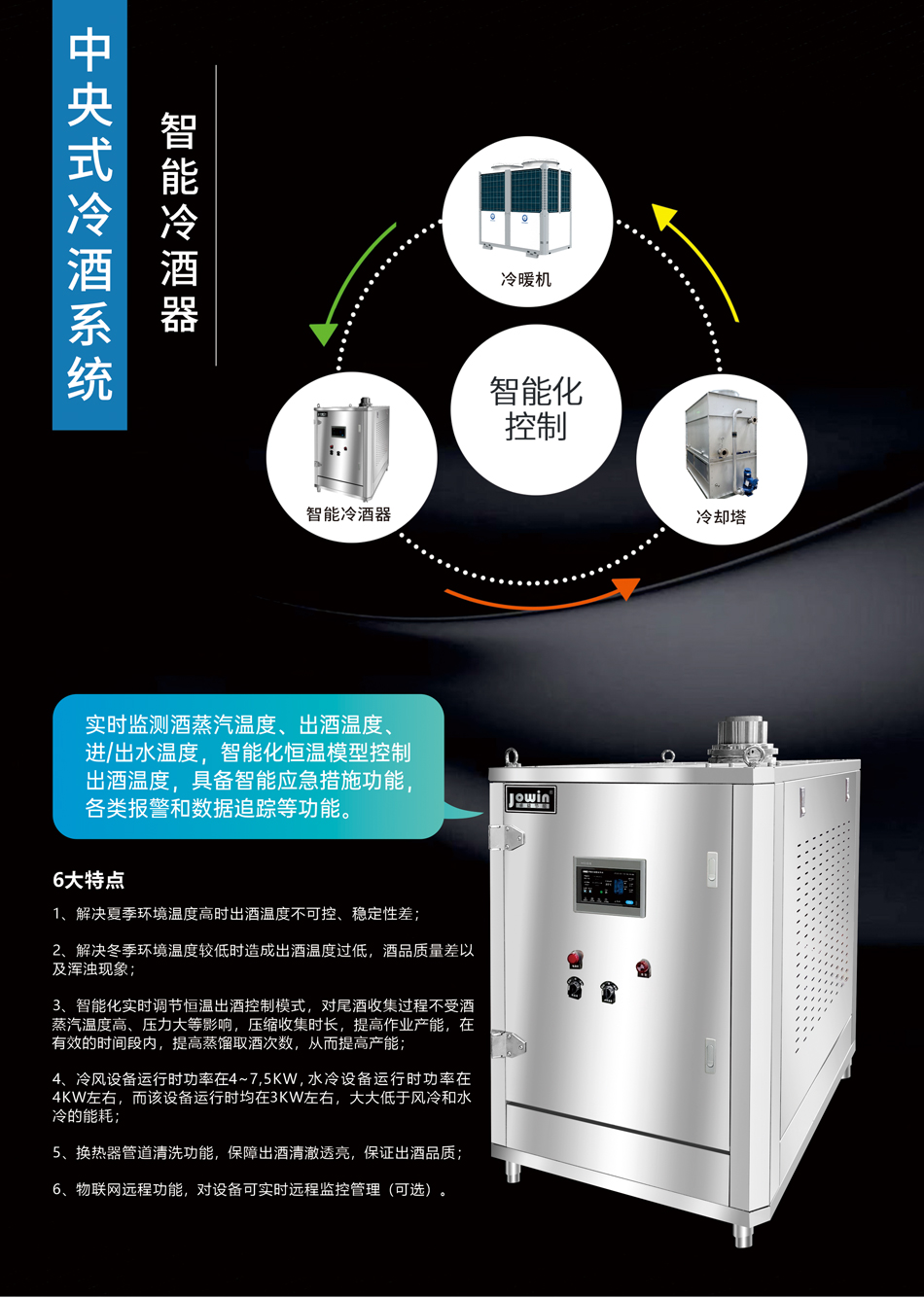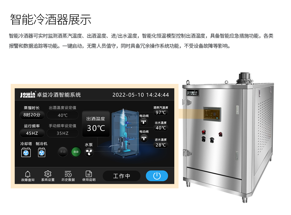 實(shí)時(shí)監(jiān)測(cè)酒蒸汽溫度、出酒溫度、進(jìn)/出水溫度,智能化恒溫模型控制 出酒溫度,具備智能應(yīng)急措施功能,各類(lèi)報(bào)警和數(shù)據(jù)追蹤等功能,換熱器管道清洗功能,保障出酒清澈透亮,保證出酒品質(zhì)。